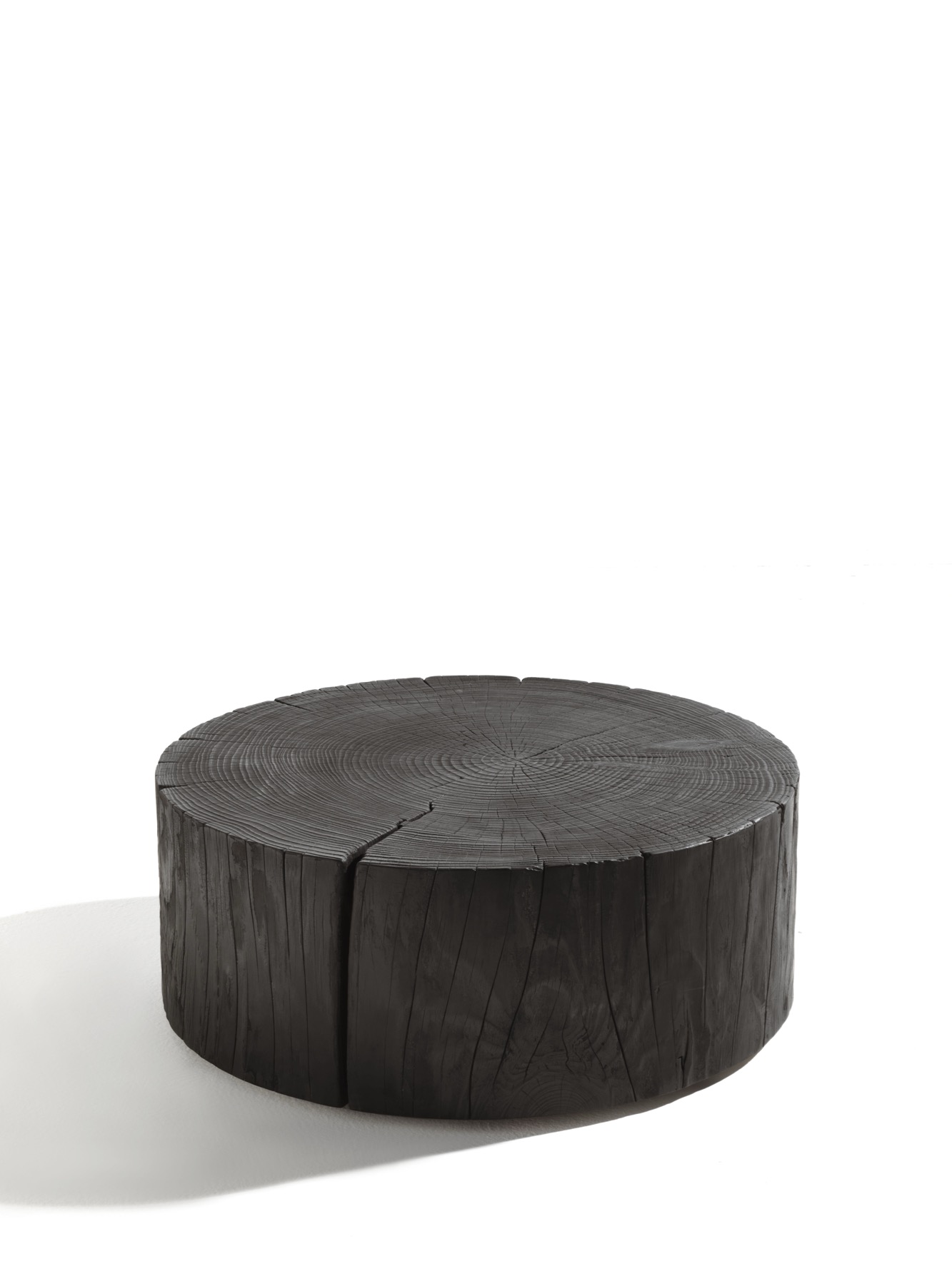 Tavolini in legno massello di cedro profumato, disponibili in due diametri, lavorati da sezioni di tronco blocco unico, che mettono in evidenza i caratteristici anelli concentrici dell’albero.