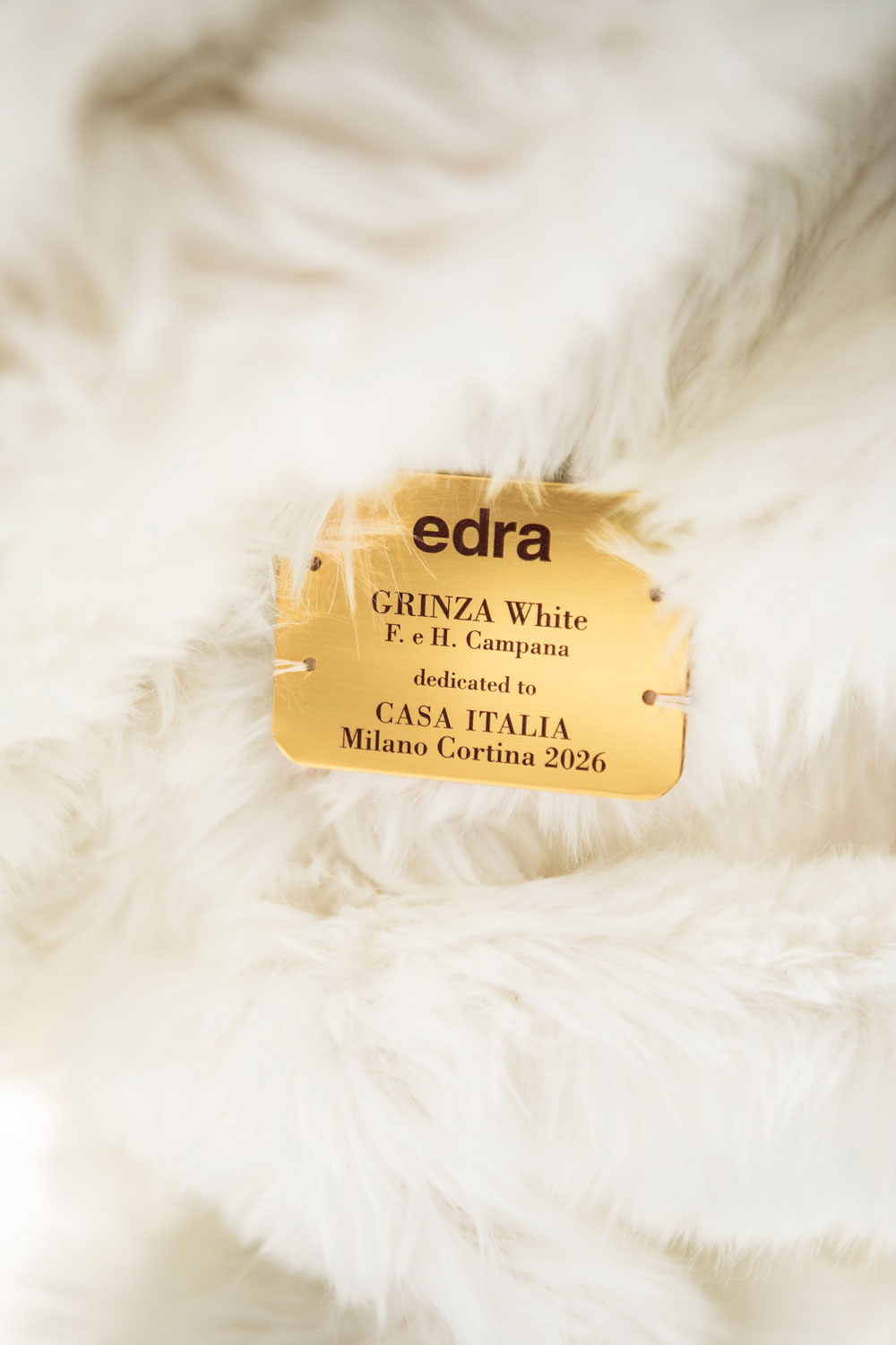 Grinza White è un’edizione speciale della storica poltrona dei Fratelli Campana. Ciascun esemplare è da considerarsi pezzo unico; realizzata manualmente in eco-pelliccia bianca, è dedicata a Casa Italia Milano Cortina 2026, come testimonia una speciale targa in ottone sul rivestimento. La materia candida leggera e piacevole al tatto evoca la sofficità della neve e la traduce in un comfort caldo, accogliente.