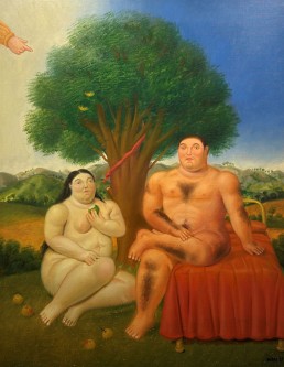 Adamo ed Eva, come tanti soggetti sacri, sono soggetti ricorrente nella produzione di Botero, fatto che sottolinea ancora il suo legame con la pittura dei Maestri italiani, come anche alcuni lavori diventati iconici: La Camera degli sposi direttamente ispirato al famoso affresco di Mantegna a Mantova, o Mona Lisa, all’età di 12 anni ispirato a Leonardo da Vinci, oggi nella collezione del MoMA.