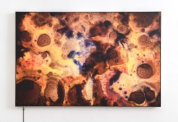 Quest’opera, premiata nell’ambito di Premio CONAI Arte Circolare promosso da CONAI, Consorzio Nazionale Imballaggi a supporto di artisti emergenti che si fanno interpreti dell’economia circolare attraverso l’arte, è una diapositiva aggredita da muffe e batteri la cui immagine di partenza si è trasformata in astrazione. Quello che osserviamo è dunque l’impronta della creatività della Natura, libera dal controllo umano. Bensasson è un artista che indaga la decadenza non solo come decomposizione, ma anche in senso sociale, come mutazione dei valori, e umano, nella progressiva perdita di vitalità dei nostri corpi. Il suo in fondo è un lavoro sul tempo e l’impossibilità di fermarlo, tema esistenziale che affronta con rigore scientifico, grazie alla conoscenza profonda dei materiali e al controllo (per quanto possibile) dei processi. “[…] Quando utilizzo un materiale deperibile voglio che sia visibile l’intero processo dall’inizio alla fine. Mi piace pensare che il mio pubblico ideale sia quello che va a vedere la mostra tutti i giorni e ogni giorno si rende conto del passare del tempo sulla materia.”